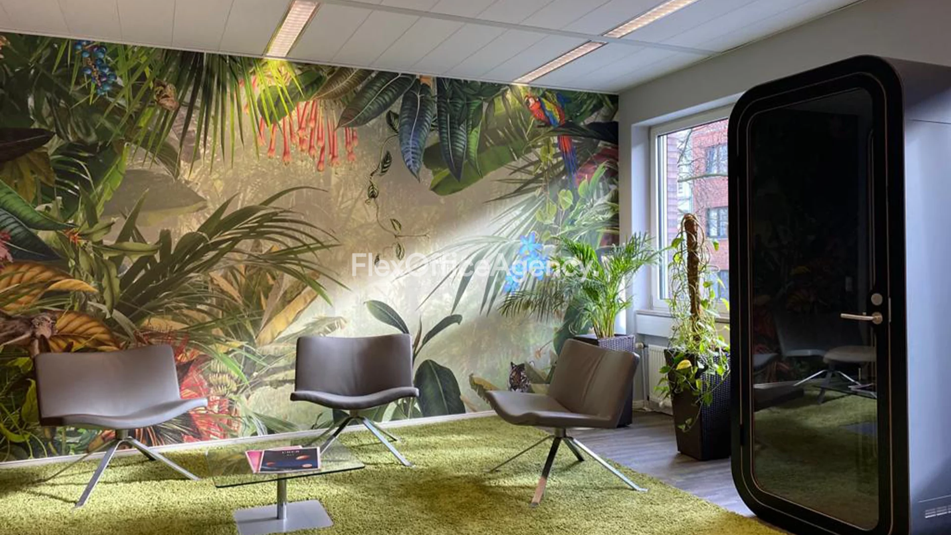 Highlights of this center include practical bicycle stands, a fully equipped kitchen, the option to display a company sign, and access to a special center app that facilitates daily office life. Additional services such as cleaning and package reception are also included. A community manager is also available for support.